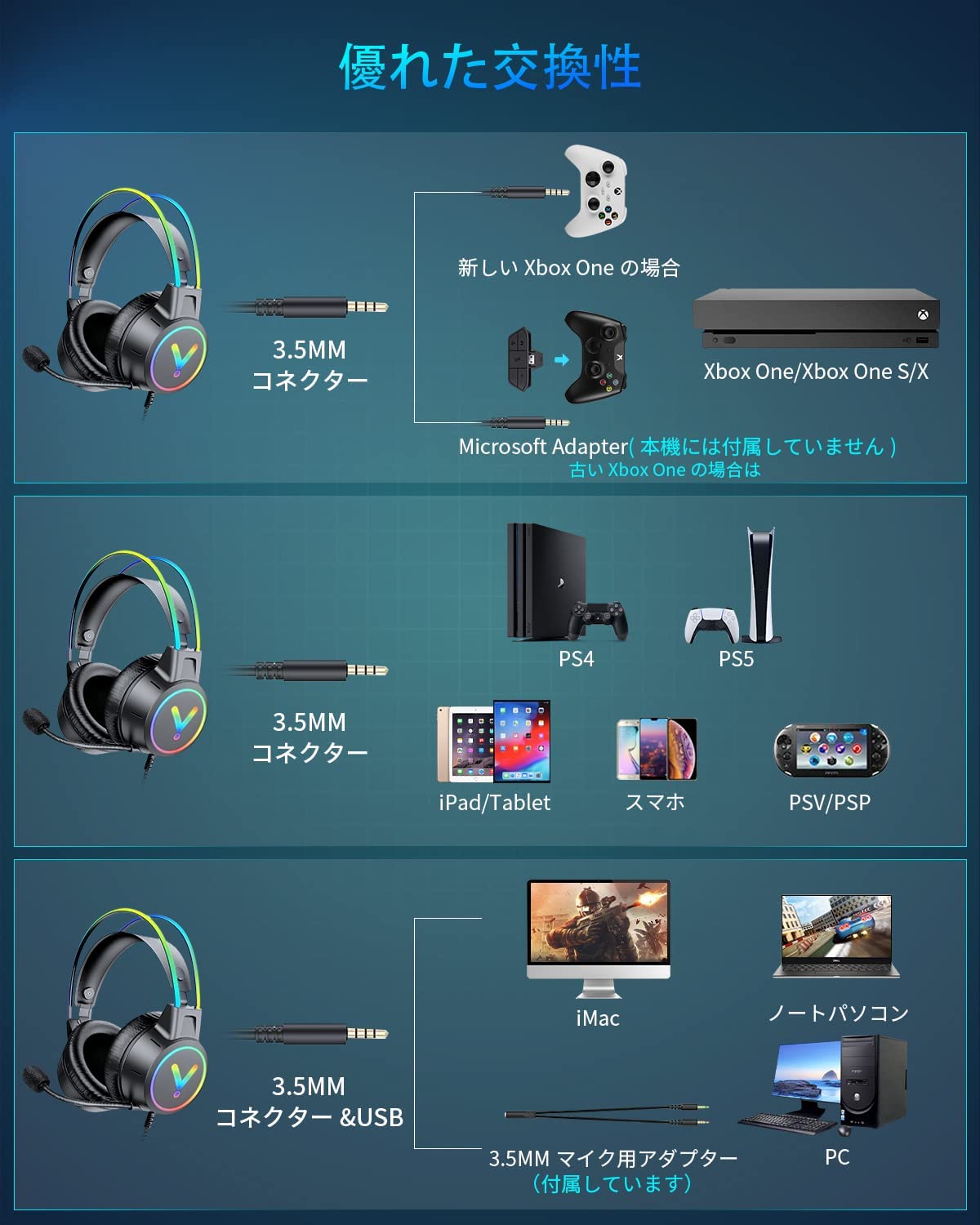 - 🌈【優れた互換性】 本体につなげるだけで直ちにゲームや音楽鑑賞、チャット等にお使い頂けます。 無料3.5mm Y型オーディオプラグ付き、本ヘッドセットはPCゲーム用として設計されていますが、オーディオプラグを使用すれば、PS4、Xbox One、パソコン、ノートパソコン、PSP、タブレット、iPad、iPhone、Mac、スマートフォンでも使用できます。注意事項:旧型Xbox Oneに接続する場合は別途Microsoft Adapter(本機には付属していません)が必要となります。